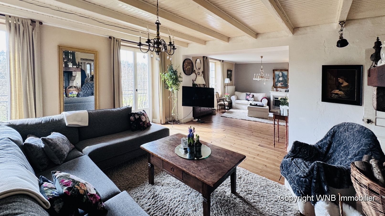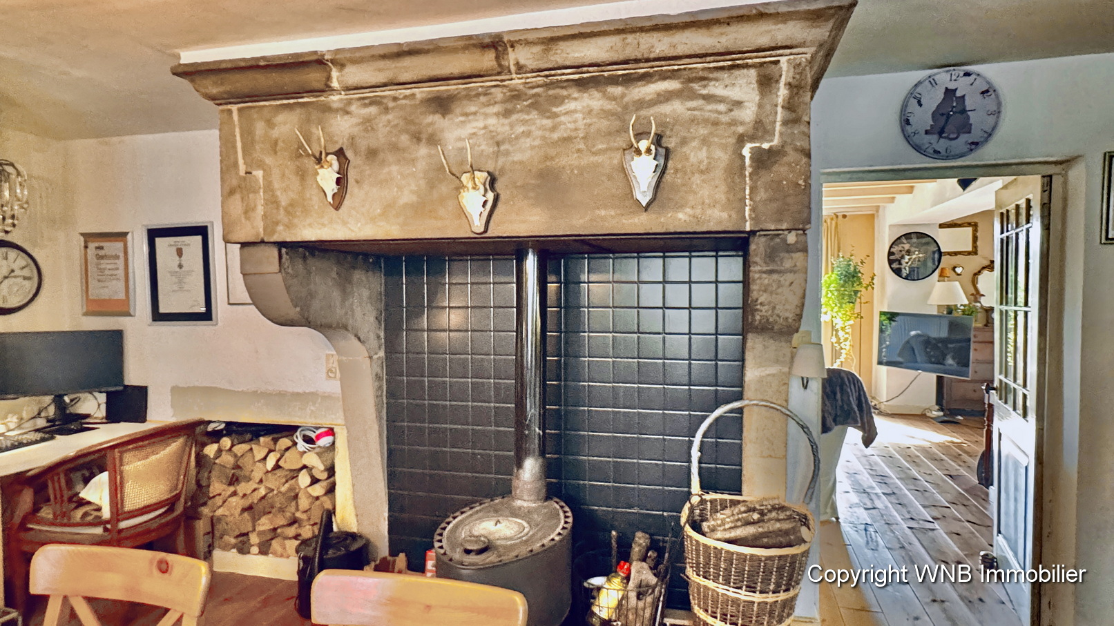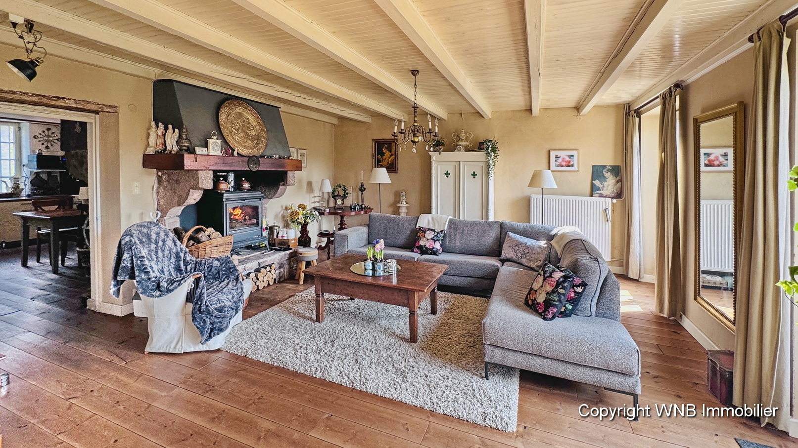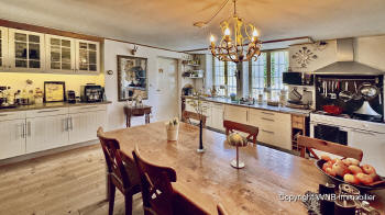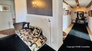 Entree 14m², keuken met natuurstenen schouw 23m², salon met haardvuur