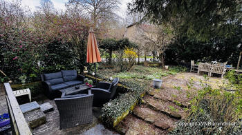Terras achter garage 19m², terras onder de bomen met mooi uitzicht.